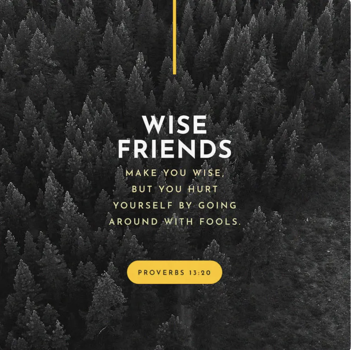 Proverbs 13:20 (NLT) “Walk with the wise and become wise; associate with fools and get in trouble.”