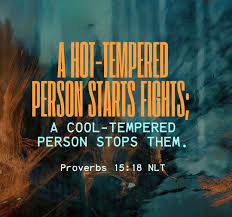 Proverbs 15:18 (NLT) “A hot-tempered person starts fights; a cool-tempered person stops them.”